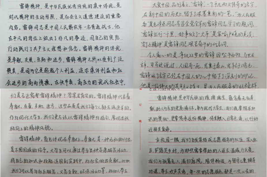 活动期间,学院学生积极响应,重点围绕雷锋精神的时代内涵、身边的“雷锋式”榜样、自身践行雷锋精神的感悟等主题,以真挚笔触,讲述校园中志愿者不辞辛劳服务师生的暖心故事,描绘社区里孤寡老人受助后展露的笑颜,探讨新时代如何传承雷锋的“钉子精神”于学业钻研之中。一篇篇征文,或激昂、或质朴,字里行间满是对雷锋精神的敬仰,这些作品展现了较高写作水准,同时凸显了同学们对雷锋精神深刻理解,从理论认知延伸至生活点滴践行。最终,评出一等奖一名,二等奖两名,三等奖三名。