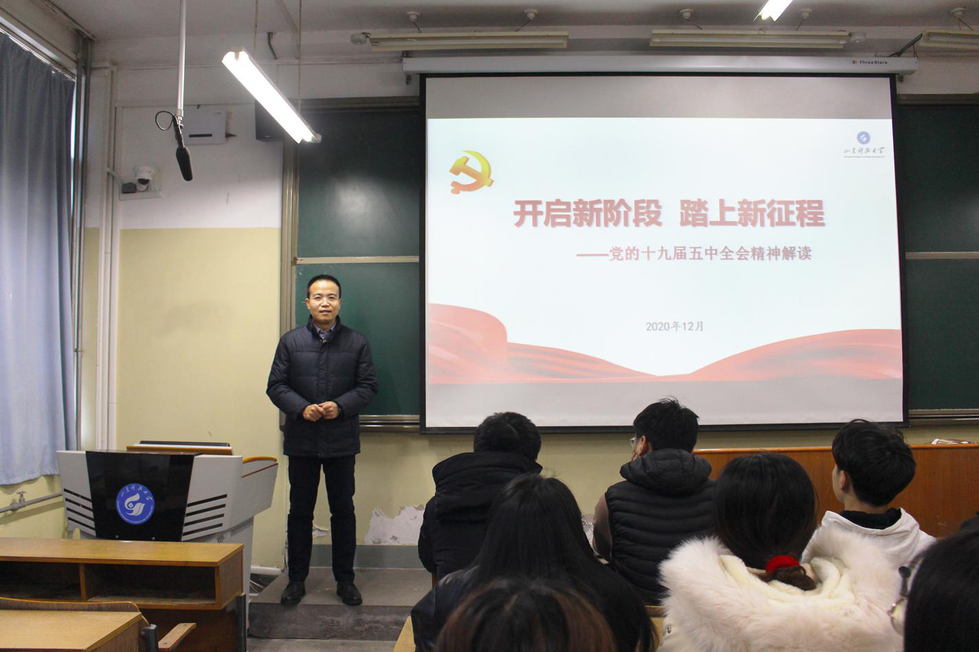 12月14日,必赢776net党委副书记兼副院长程家国在5#104为所带班级作“党的十九届五中全会精神”宣讲会,安全工程专业2018级全体学生参与。