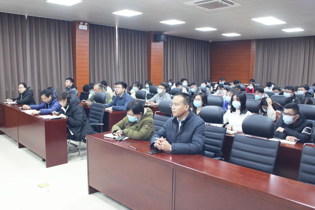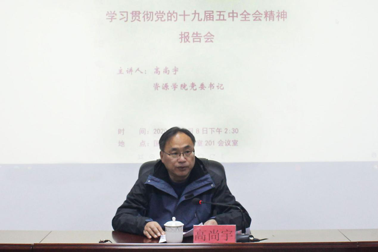 高尚宇在会上指出,十九届五中全会是在我国将进入新发展阶段、实现中华民族伟大复兴正处在关键时期召开的一次具有全局性和历史意义的重要会议,如何学习好、贯彻好、领会好全会精神内涵是学院师生正面临的首要课题。随后,高尚宇围绕“全球新格局”“发展新目标”“执政新理念”“建设新成就”四个方面,带领学院师生深刻解读党的十九届五中全会精神,系统梳理新时代、新时期下的远景目标。他强调,放眼国际,世界百年未有之大变局进入加速演变时期,经济、科技、文化、安全、政治等格局深刻调整,面对错综复杂的国际形势、艰巨繁重的改革发展任务与新冠疫情的严重冲击,以习近平同志为核心的党中央不忘初心、牢记使命,团结带领全党全国各族人民砥砺前行、开拓创新、奋发有为,推进党和国家各项事业,战胜各种风险挑战,使得中国特色社会主义的航船继续乘风破浪、坚毅前行。实践再次证明,只有紧密团结在党中央的旗帜之下,才能建功宏伟时代、实现家国梦想。学院师生要准确把握党的领导核心作用,坚持不懈用习近平新时代中国特色社会主义思想武装头脑、指导实践、推动工作。