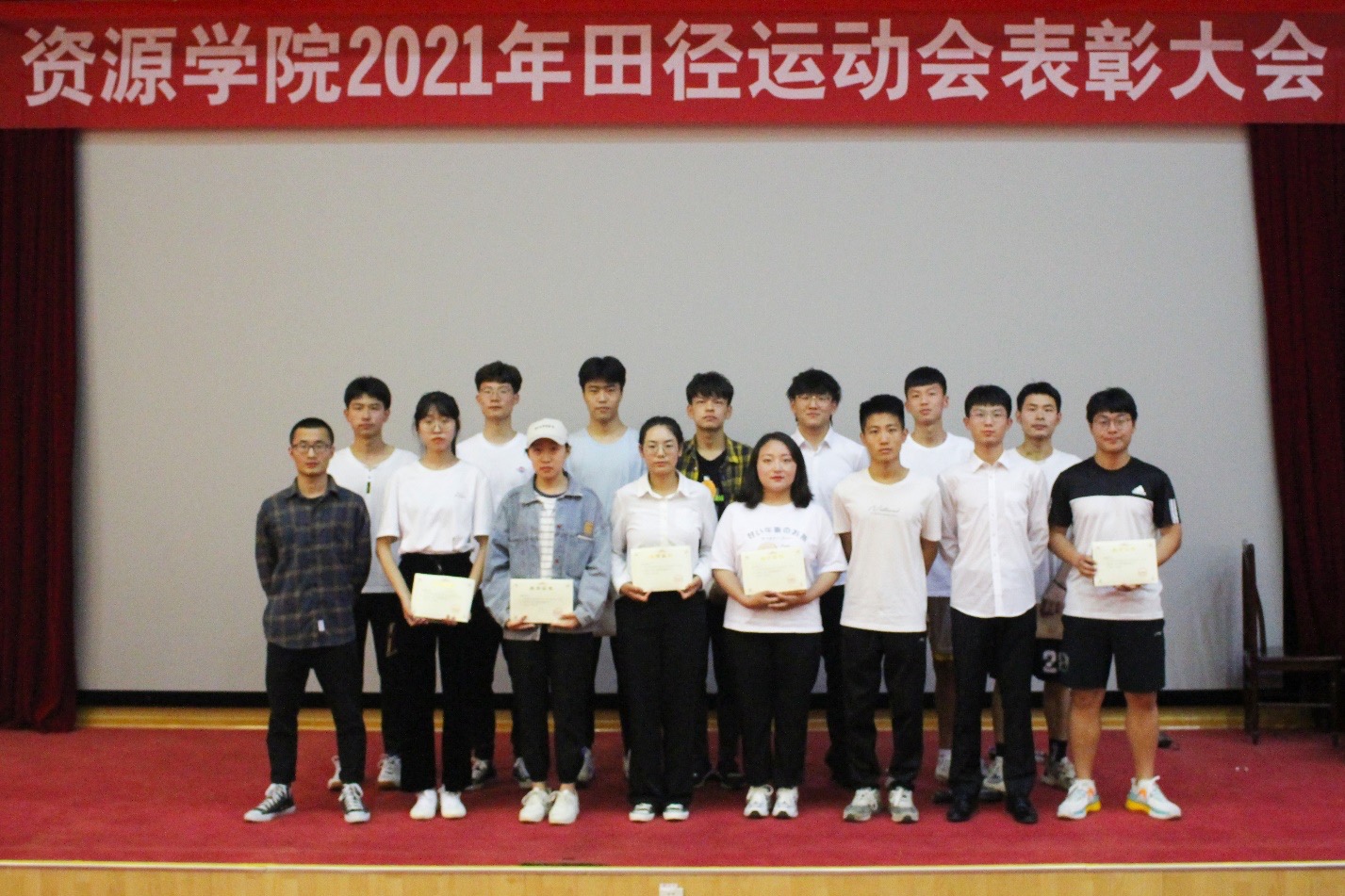 5月25日,必赢776net在四号楼报告厅召开2021年田径运动会表彰大会。学院党委副书记兼副院长程家国、团委书记洒艳、学院辅导员张运忠、卢业美、学生会负责人姜自健出席大会。会议由学院辅导员王淦主持,学院运动员代表与学生代表参会。