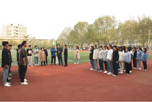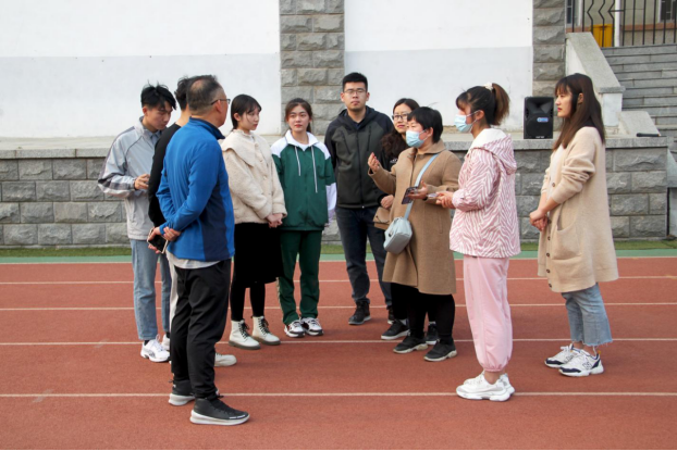 更好备战校区春季运动会,确保学院开幕式方队训练有序进行,4月9日,学院团委书记洒艳全体辅导员指导同学们训练他们加油鼓劲