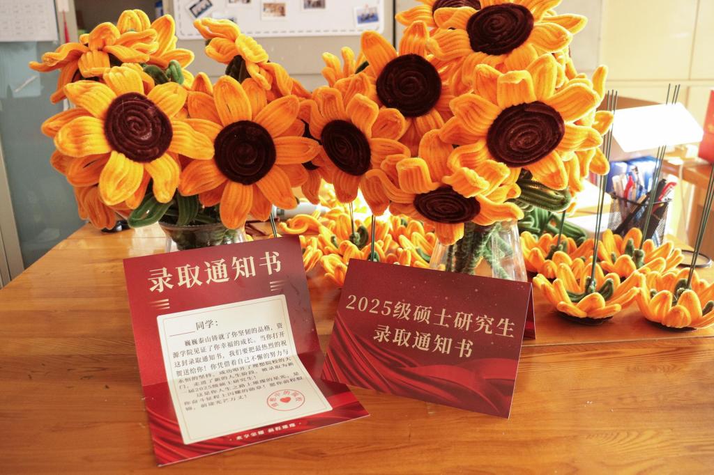 活动准备阶段,学生会组织同学们使用扭扭棒为考研学子制作向日葵花束,并将向日葵花束摆放至每个考研自习室。束束向日葵,灿烂绽放,寓意着“一举夺魁”,承载着学院对考研学子最真挚的祝福和最美好的祝愿,传递金榜题名的美好期许。