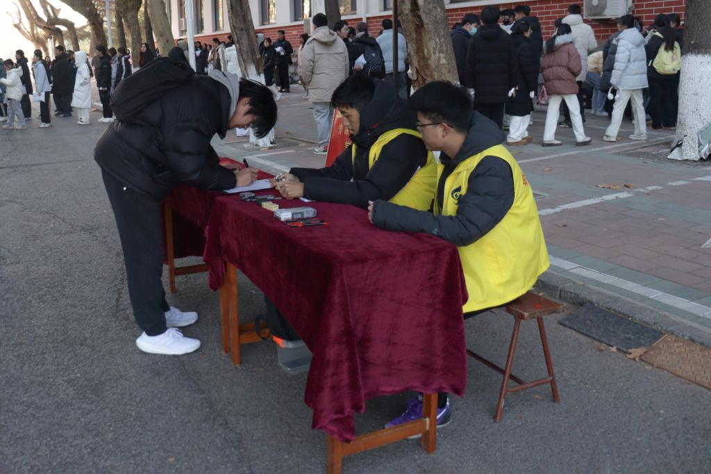 学生会工作人员提前布置好桌椅与展板,准备好听力专用耳机、电池、涂卡笔、橡皮等考试必需用品,为考生提供出借服务,助力四六级考试顺利进行。学院全体辅导员到场,为考生加油打气、保驾护航。领取考试用品的同学纷纷表示感谢:“在这紧张的考试时刻,学院提供细致入微的服务如同冬日里的阳光,直抵人心,给予了我们无比的信心和勇气,我们必将全力以赴,不负所望。”