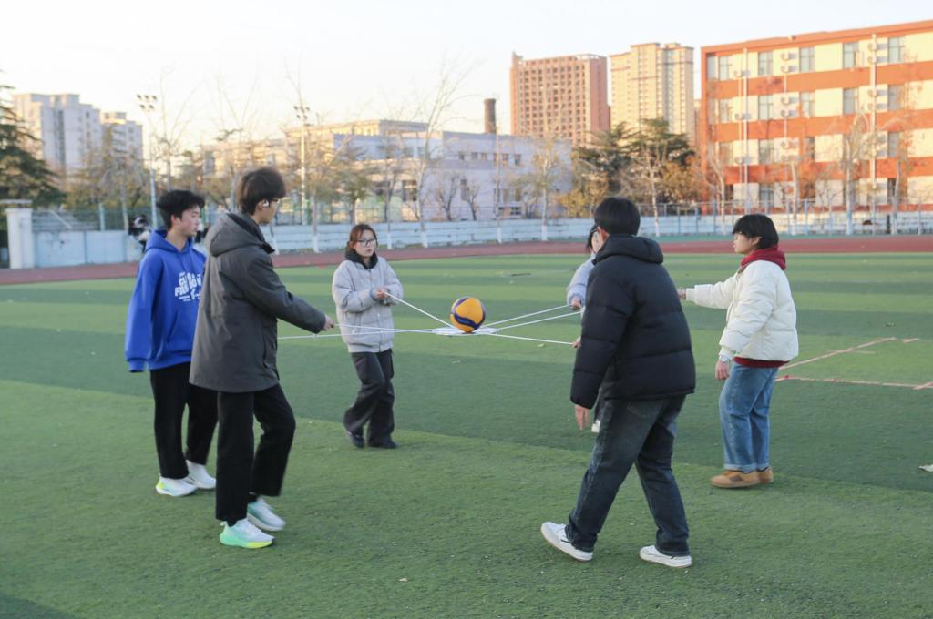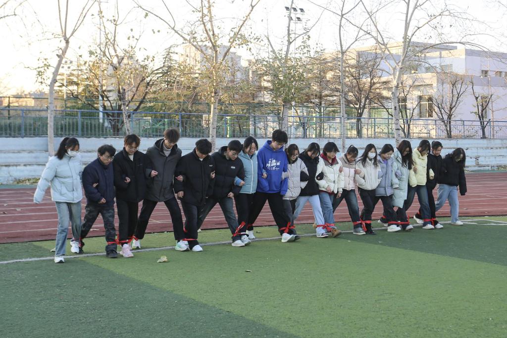 本阶段比赛共设置“十人九足”“不倒森林”“众星捧月”和“滚雪球”四个项目,各队以接力形式完成全部环节,依据总用时进行排名。在“十人九足”中,同学们并肩协作,绑腿前行,步伐一致向前迈进,展现出高度的默契配合;“不倒森林”环节,队员们围圈持棍,随着口令迅速移动换位,稳稳接住每一根木棍,动作流畅有序;“众星捧月”项目中,大家合力牵引圆盘四周绳索,将排球平稳托举并协调运球前进,考验着团队的平衡与协作能力;最后的“滚雪球”比赛,队员们以击掌为令完成折返跑接力,并精准完成沙包射门任务,将现场气氛推向高潮。